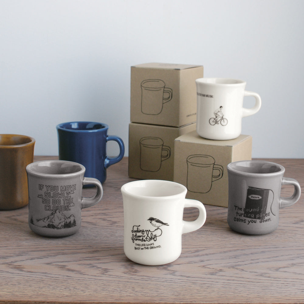 The earthy tones and clay texture of these SCS mugs print are so homey and cozy you won't be able to resist wrapping your hands around them. The chunky yet refined shape makes them perfect for your daily cup of coffee.